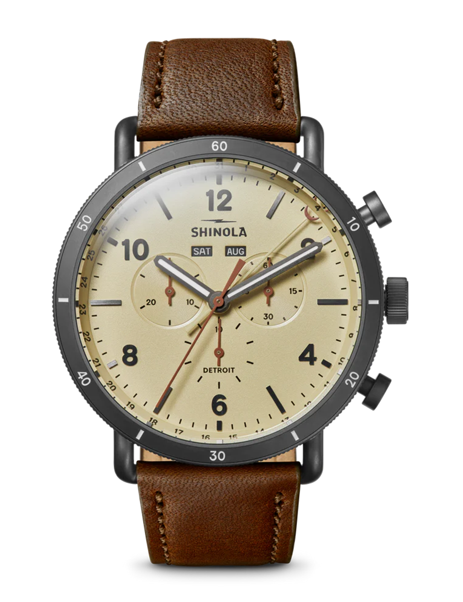 Shinola Canfield Sport chronograph, quartz movement, 45mm Sandblasted PVD Gunmetal case, push-down crown, black ceramic bezel, sapphire crystal, cream dial, cattail brown leather strap