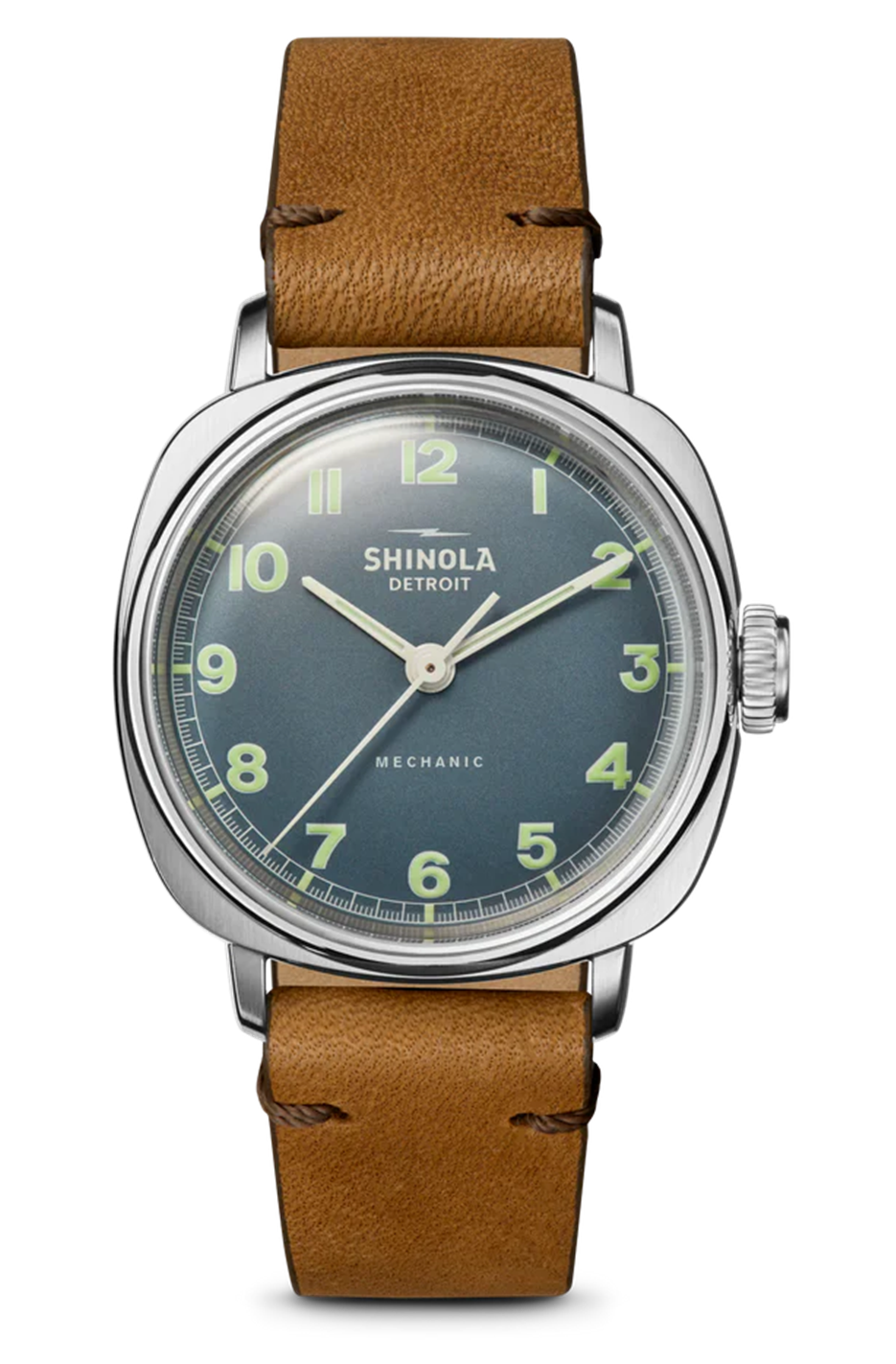 Shinola Mechanic manual wind, 39mm stainless steel case, push-down crown, exhibition case back, steel blue dial, British tan leather strap